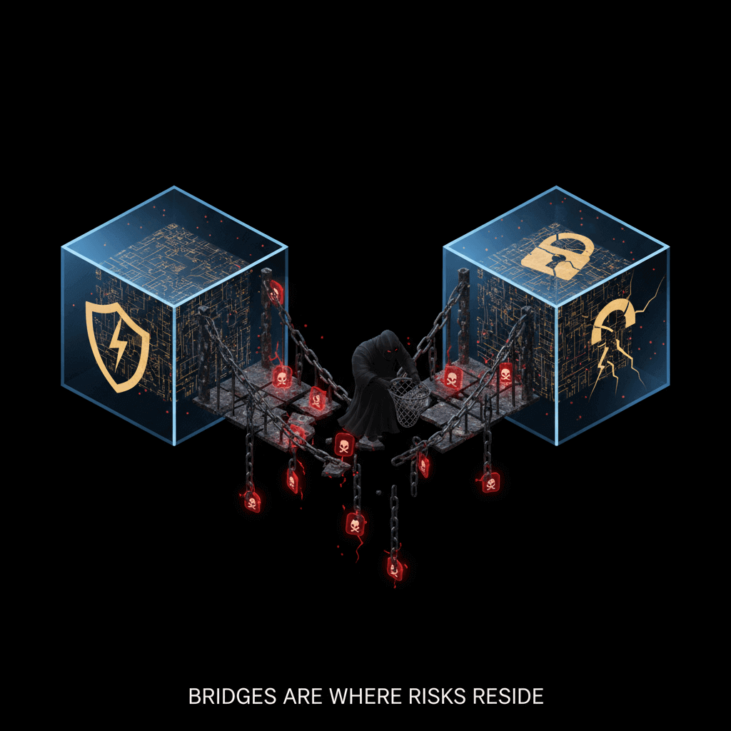 Nhưng cây cầu thì không phải con đường. Nó là chỗ hẹp, chỗ tập trung, chỗ dễ bị nhắm nhất. Các chuỗi có thể tự vận hành rất chặt, nhưng chỉ cần một cây cầu yếu, toàn bộ những gì chảy qua đó đều đứng trước rủi ro. Bridge không làm cho hệ sinh thái rộng ra an toàn hơn, nó chỉ tạo ra thêm một nơi để rủi ro trú ngụ.