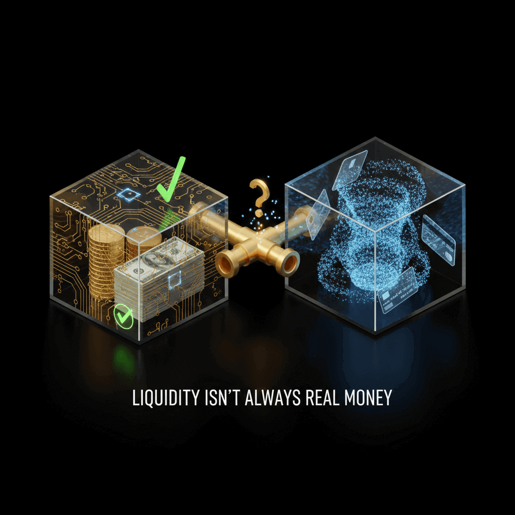 Nhưng thanh khoản không phải là tiền, nó là một hình dạng của thị trường trong một khoảnh khắc. Khi khoảnh khắc đó đổi, hình dạng cũng đổi. Cuốn sổ có thể ghi số rất đẹp, nhưng khi nhiều người cùng bước ra, phần “có thể đổi” co lại rất nhanh. Liquidity không biến thành tiền khi cần, nó chỉ cho thấy ở thời điểm yên ả, việc đổi chác trông có vẻ dễ dàng đến mức nào.