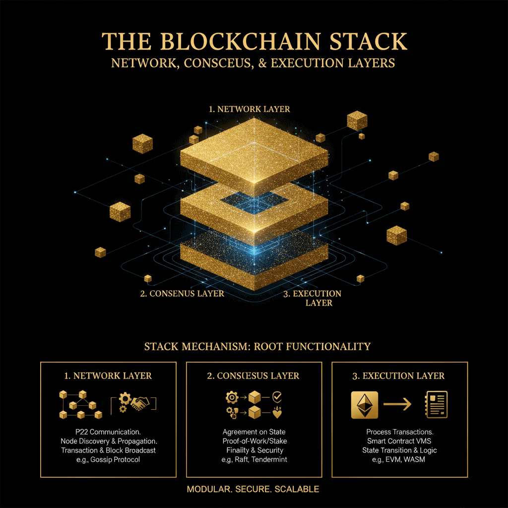 Trong kiến trúc blockchain hiện đại, hệ thống được chia thành ba lớp cơ bản: lớp mạng (network layer), lớp đồng thuận (consensus layer) và lớp thực thi (execution layer). Mỗi lớp đảm nhận vai trò riêng nhưng phối hợp nhịp nhàng để đảm bảo blockchain vận hành phi tập trung, minh bạch, an toàn và có khả năng mở rộng cao.