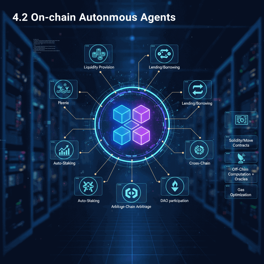 Logic agent triển khai trực tiếp trên smart contract (Solidity trên Ethereum, Move trên Aptos/Sui). Smart contract định nghĩa điều kiện kích hoạt, giới hạn rủi ro và execution logic. Hành động thực hiện on-chain, trustless và minh bạch.