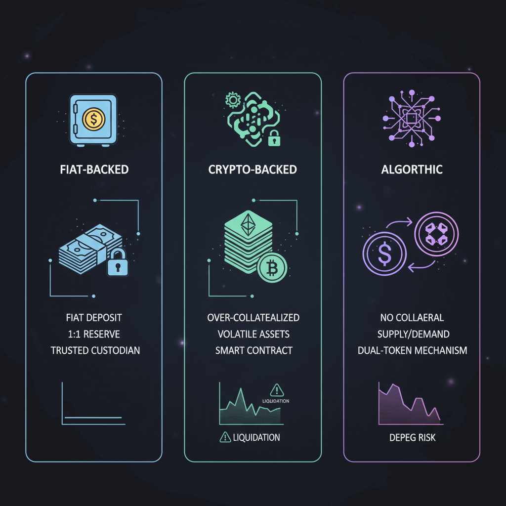 So sánh fiat-backed vs crypto-backed vs algorithmic stablecoin