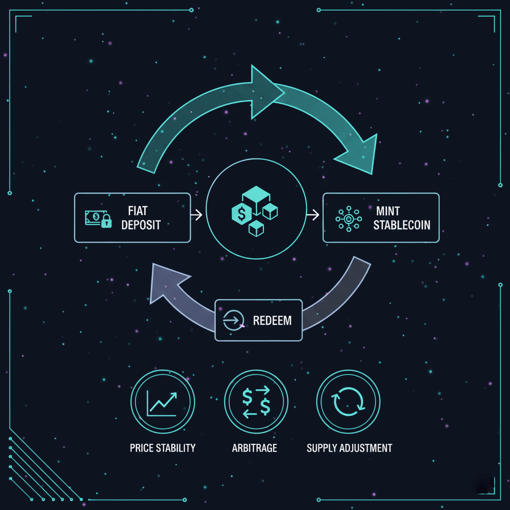 Cả fiat-backed và crypto-backed đều dựa vào cơ chế mint–redeem để duy trì peg 1:1:
